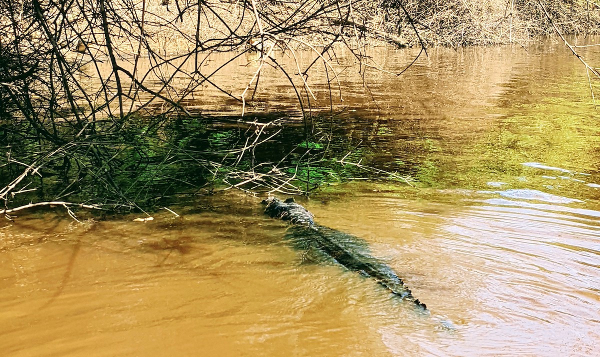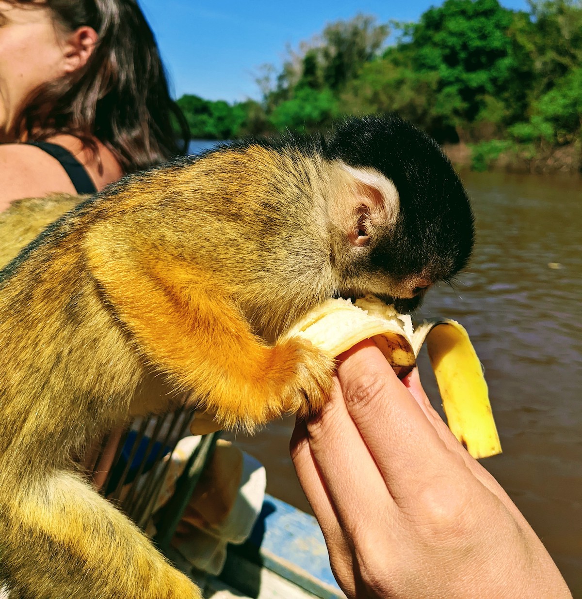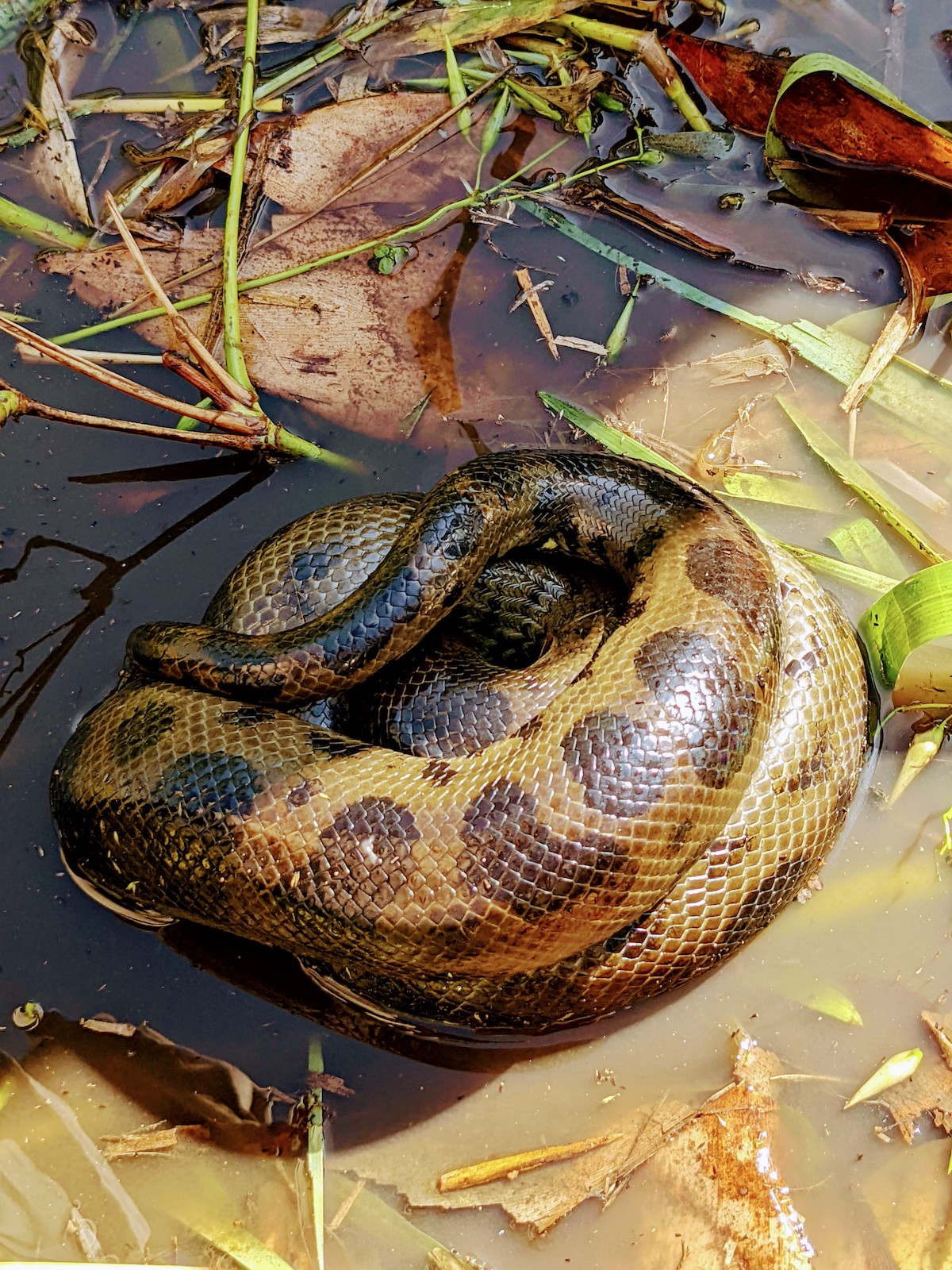 Am nächsten Morgen gehen wir auf die Suche nach einer Anaconda. Wir waten mit Gummistiefeln durch sumpfiges Gebiet – ich bin froh, läuft der Guide zuvorderst🙌 Nach ca. einer Stunde treffen wir auf eine junge Anaconda die etwa 1.5m lang ist. Ich bin überrascht wie langsam und scheinbar ungefährlich das Tier ist – die Anaconda ist eine Würgeschlange, also nicht giftig. Jeder hält das Tier mal und macht alle möglichen Posen damit. Der Guide betont, das wir das Tier in seinem natürlichen Habitat sehen und nicht stören. Als wir das Tier wieder loslassen, rollt es sich aber klein zusammen und scheint eher verängstigt – ich frage mich eine bisschen, ob es wirklich nötig war, das Tier so zu behandeln… Danach geht’s zurück zu unserem Camp, wo wir einen sehr feinen Zmittag geniessen dürfen👏