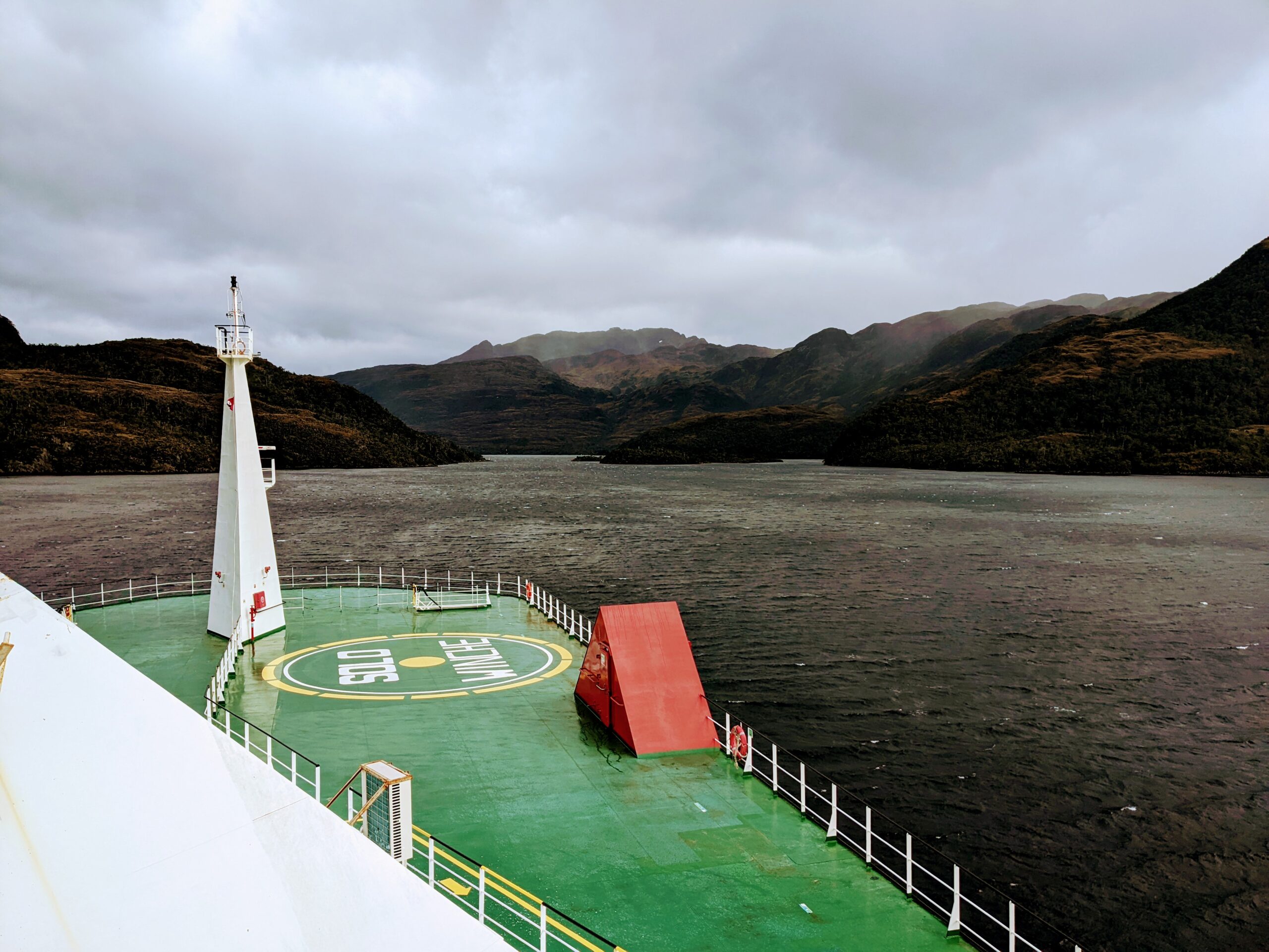 Trotz des relativ starken Windes zur Küste hin, können wir ablegen und unsere Fahrt geht um 9:00 los🤙 Das Wetter ist schön, der Wind bläst aber ziemlich stark. An diesem ersten Tag erleben wir, wie stark der Wind in Patagonien sein kann. Wir bleiben am Bug des Schiffes und erleben gemessene Windspitzen bis zu 130km/h an einem Ort den sie hier Windfactory nennen!😱 – da muss man sich gut festhalten😉 – es ist die Passage der Andenausläufer nach Süden.
