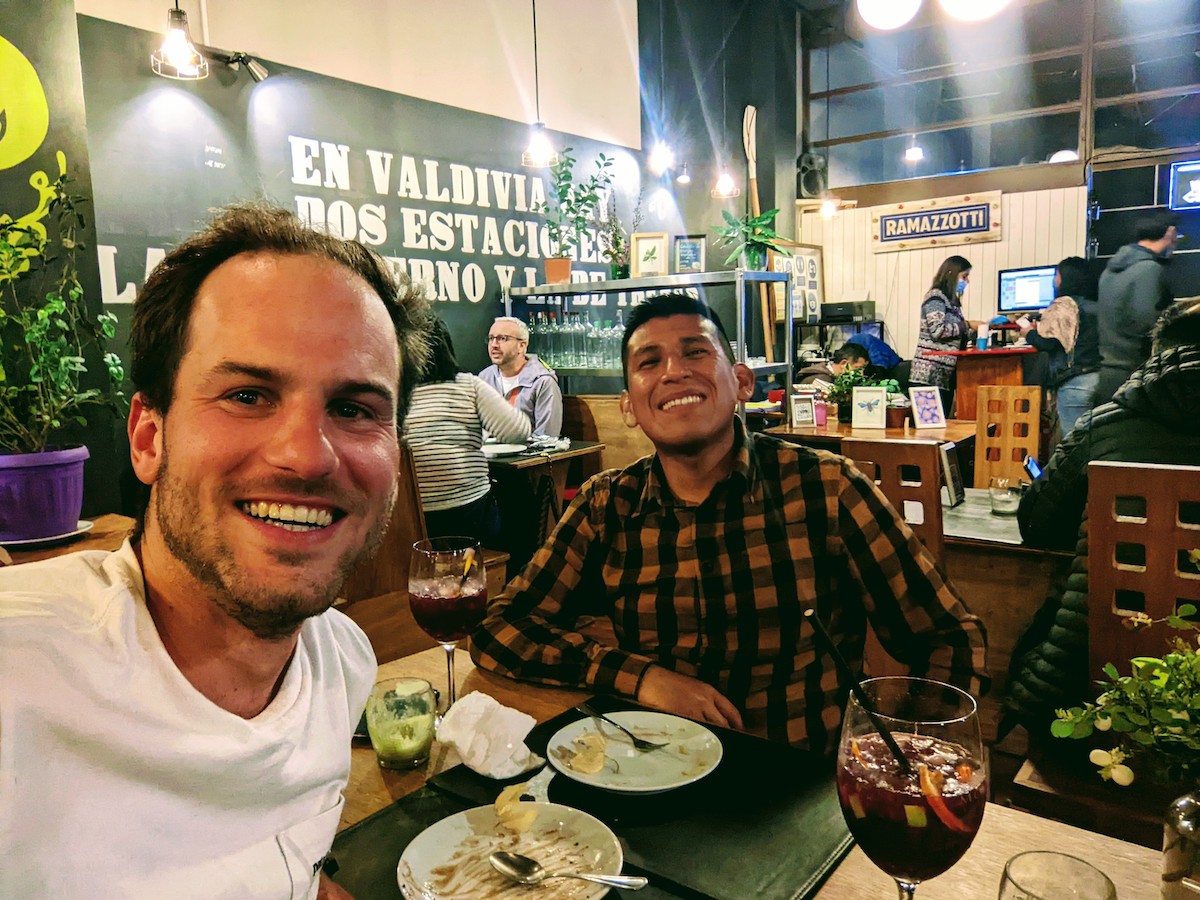 Ich gönne mir Empanadas und geniesse den Nachmittag am Strand. Danach geht’s zurück nach Valdivia, wo ich Jassu wiedertreffe und wir essen im «Mesa Incognita» Znacht – wahrscheinlich das beste Restaurant auf meiner ganzen Reise bis anhin! Danach geht’s noch feiern und am nächsten Tag bei Zeiten weiter nach Pucon.