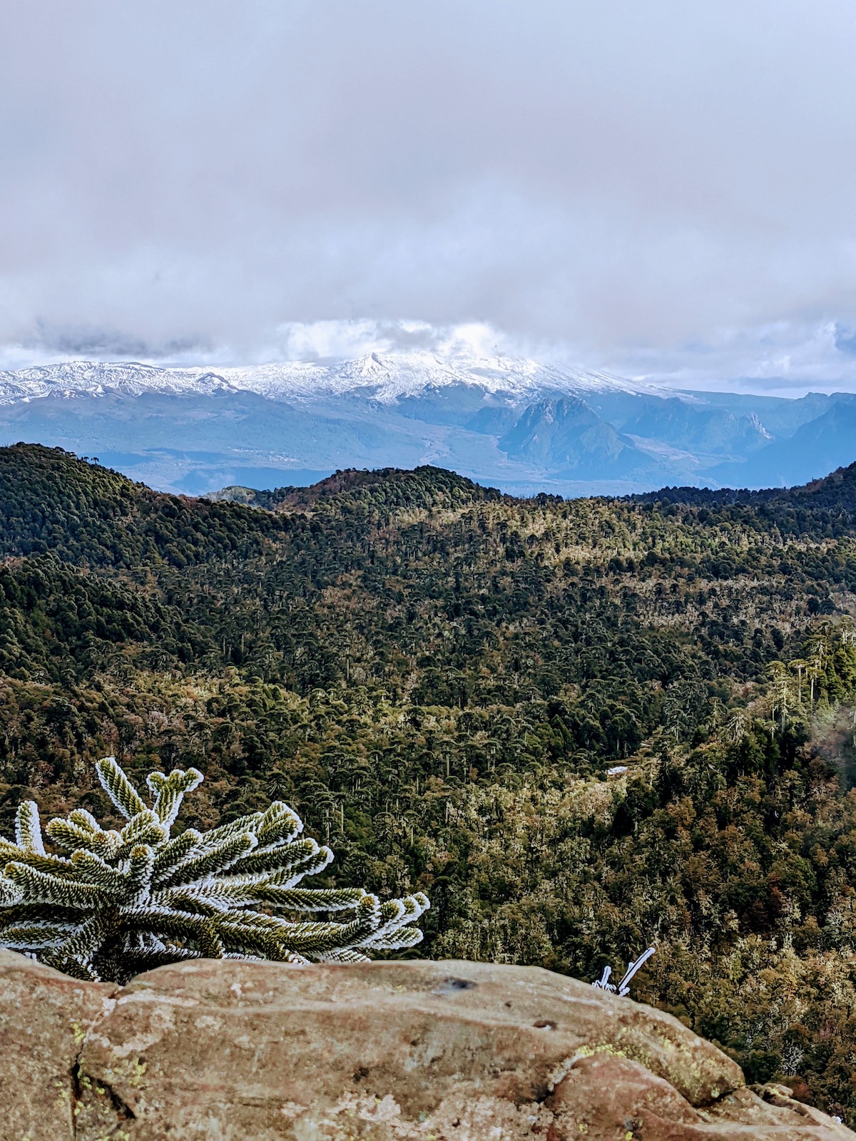 Am Dienstag gehe ich mit Foster (den ich vom Torres del Paine kannte) auf die «El Cañi» Wanderung. Wir treffen auf Regen und Schnee beim Aufstieg. Da ab 14:00 aber besseres Wetter angesagt und die Fernsicht beim Gipfel das schöne an dieser Wanderung ist, halten wir durch. Schlussendlich kommen wir kurz nach 14:00 am Gipfel an und tatsächlich hat sich das Wetter gelichtet. Von Schnee präsentieren sich die Bäume in ganz spezieller Form – ein wunderschöner Ausblick!