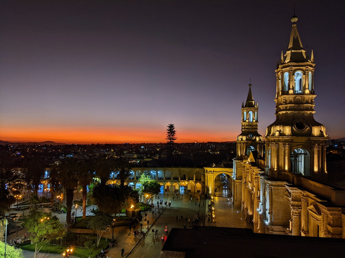 Am kommenden Morgen komme ich gegen 7 Uhr in Arequipa an. Ich nehme ein Taxi ins Hostel Flying Dog, dessen Manager Jassu kennt und der es für mich reserviert hat🤙 danach geht’s los ins 5-Sterne Hotel Solento, in dem mich ein riesiges Frühstücksbuffet erwartet. Auch dies hat Jassu organisiert, da er diesem Hotel den Service einmal geleitet hat. Nachdem ich ausgiebig gefrühstückt habe, gehe ich auf die Suche nach einer 1-Tagestour in den Colca Canyon, der die grosse Attraktion in dieser Region darstellt. Hätte man mehr Zeit könnte man auch eine 2- oder 3-tägige Wanderung in den Canyon machen. Hätte mir bestimmt noch besser gefallen, aber auch so waren die Aussichten und Fotospots an denen unser Van gehalten hat spektakulär. Zurück zum ersten Tag: ich erkundige die Stadt – im Stadtzentrum ist alles gut zu Fuss erreichbar. Nachdem wir in Restaurant Las Terrazas, den Sonnenuntergang genossen haben, gehe ich dann relativ bei Zeiten nach Hause. Der Ausflug in den Colca Canyon beginnt am Morgen um 3:00!