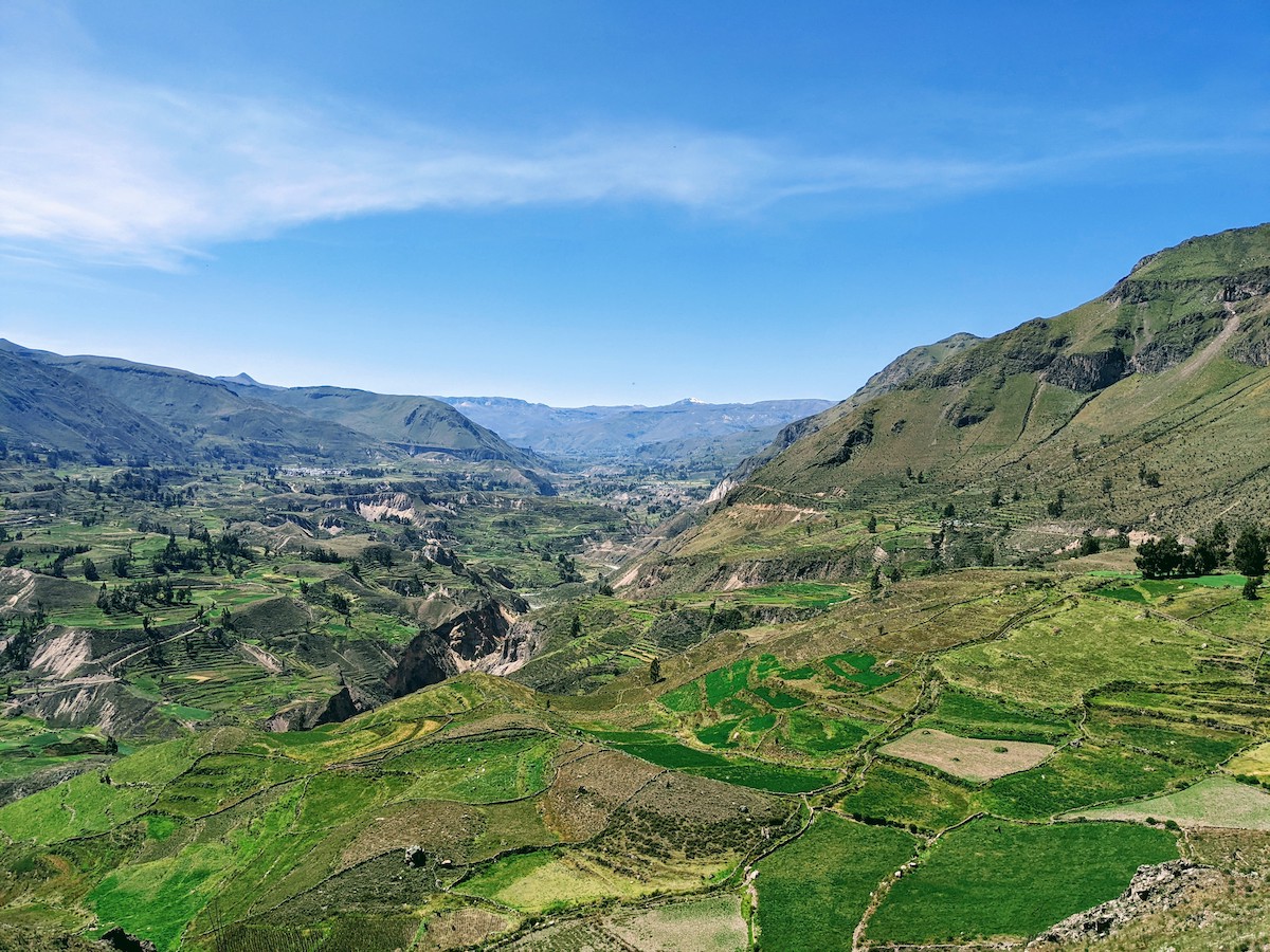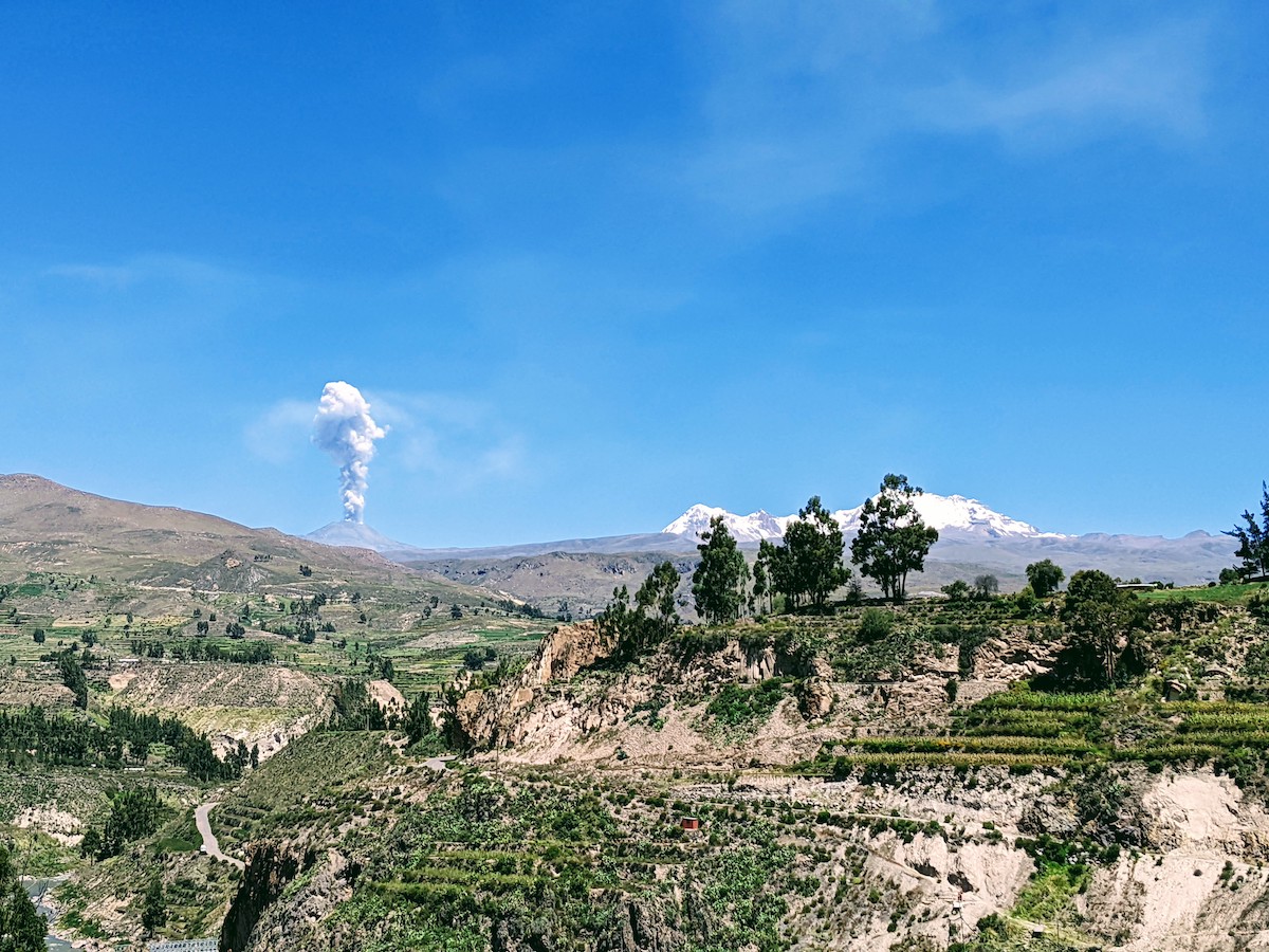 Danach geht’s weiter an einen relativ unnötigen Stop, bei dem Kleider verkauft werden und man Fotos mit Alpacas und lokalen Einwohnern machen kann – die Art von Tourismus, die mir gar nicht gefällt🙈 Nachdem wir den Eintritt für den Colca Canyon bezahlt haben, geht’s zum ersten Viewpoint im Canyon – wir sehen zwar noch keine Kondore, die Aussicht ist aber wunderschön🤩 Danach geht’s weiter zum eigentlichen Highlight der Tour, einem Viewpoint im Colca Canyon, an dem wir 50 Minuten Zeit haben, ein wenig zu spazieren und Fotos der beeindruckenden Segler zu schiessen. Nachdem wir noch einen weiteren Viewpoint kurz angeschaut haben, geht’s weiter an einen Ort, wo man entweder Quad fahren oder in den Termen baden gehen kann. Da mindestens 20 Touren die gleiche Runde machen, ist alles sehr überfüllt und ich laufe ein wenig den Hügel hoch, um eine schönere Aussicht auf den nahegelegenen Vulkan und ein bisschen Abstand vom Getümel zu haben. Um 12:30 geht’s weiter zum Mittagessen, am gleichen Ort, wo wir gefrühstückt haben. Nach der Pause fahren wir wieder zurück nach Arequipa, wo wir um 17:30 ankommen. Nach einem kurzen Znacht geht’s um 20:00 wieder auf den Bus zurück nach Cusco.