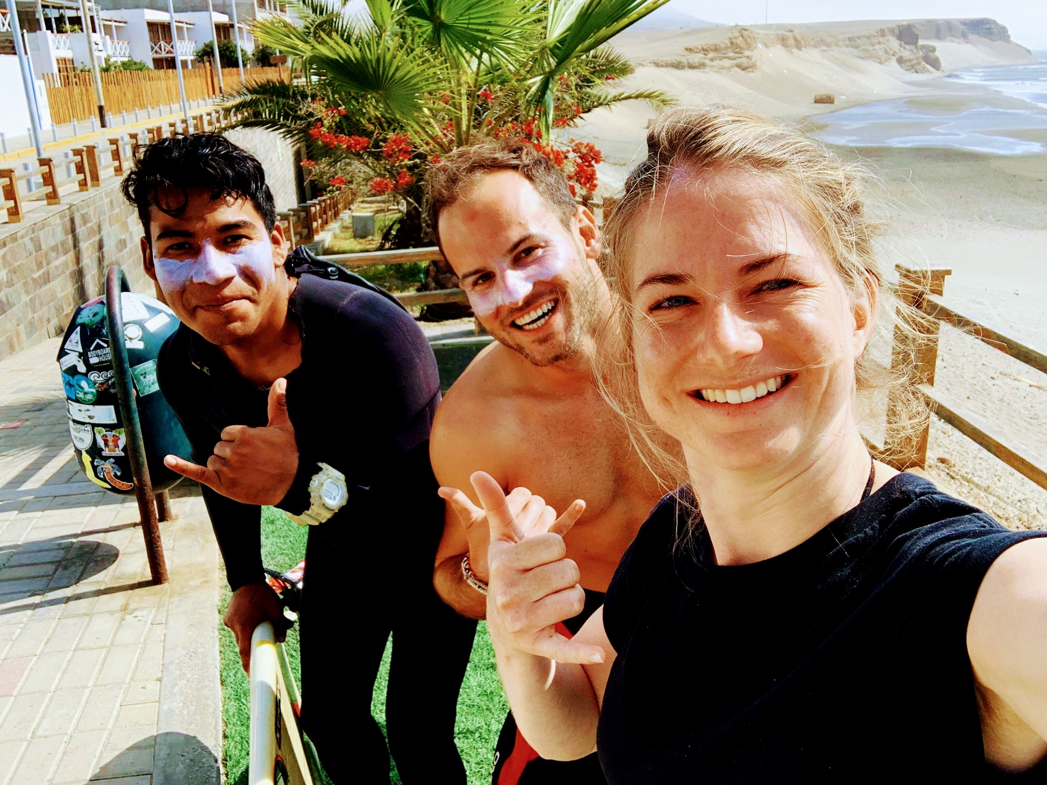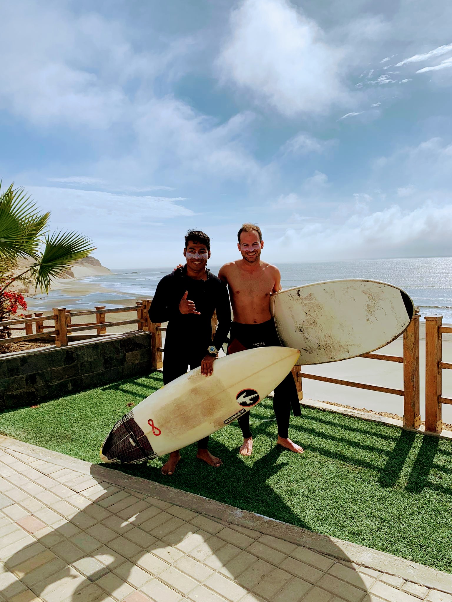 Am nächsten Morgen gibt’s zuerst Frühstück und gleich danach geht’s los ins kalte Meer. Es funktioniert bei beiden erstaunlich gut. Mit dem Ziel eine Welle zu surfen, stehen wir fast jede Welle🤩 – aber natürlich mit wenig Hilfe von Luiz😋. Generell sind wir aber sehr positiv überrascht😇 Am Nachmittag erkunden wir Puerto Chicama noch etwas, und gehen früh ins Bett, Michelle hat noch etwas Jetlag und kann bereits um 20:00 pfuuse.