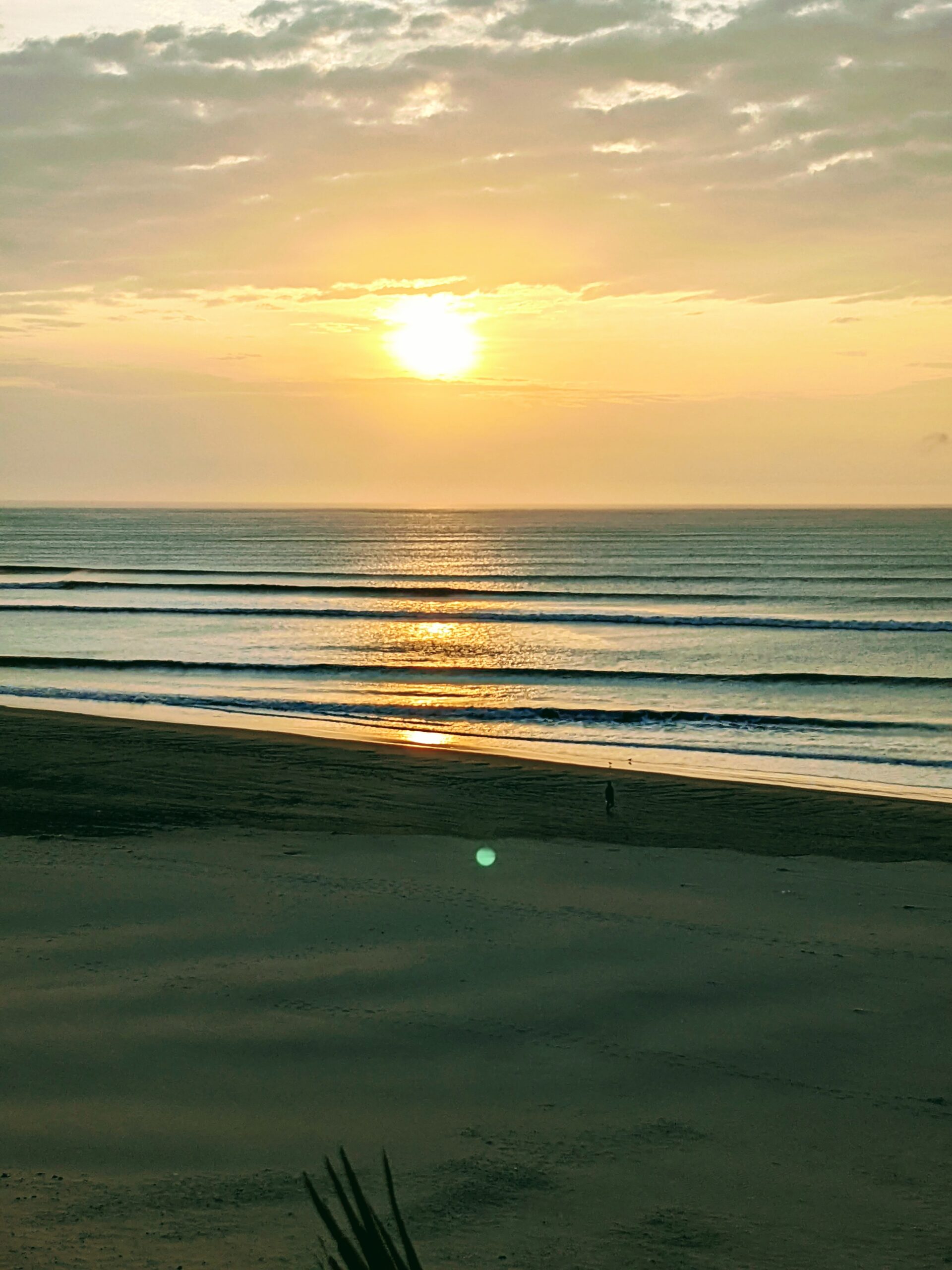 Am folgenden Tag (Montag) gehen wir um 8:00 surfen – vor dem Frühstück, welches es von 8:00-11:00 gibt. Denn am Tag zuvor war das Ganze etwas gedrängt, und wir hatten einen etwas vollen Buuch beim Surfen🥴 Obwohl wir bedeutend weniger Wellen erwischen, macht es grossen Spass und wir können unsere erste Welle selber anpaddeln. Am Nachmittag gehen wir deshalb gleich noch einmal – diesmal allerdings etwas weniger erfolgreich. Am Abend um 17:00 sind wir bei Manolo (Kolumbien) und Eleonor (Belgien) zum Pizza essen eingeladen. Die zwei sind auf unbestimmte Dauer mit einem VW Bus als «Viajeros Kombinados» unterwegs. Wir bringen Bier und sie machen selber Pizza (uuu fein🚀). Wir verbringen mit den Zweien und José aus London sowie Sylvain aus Mayotte einen lässigen Abend.